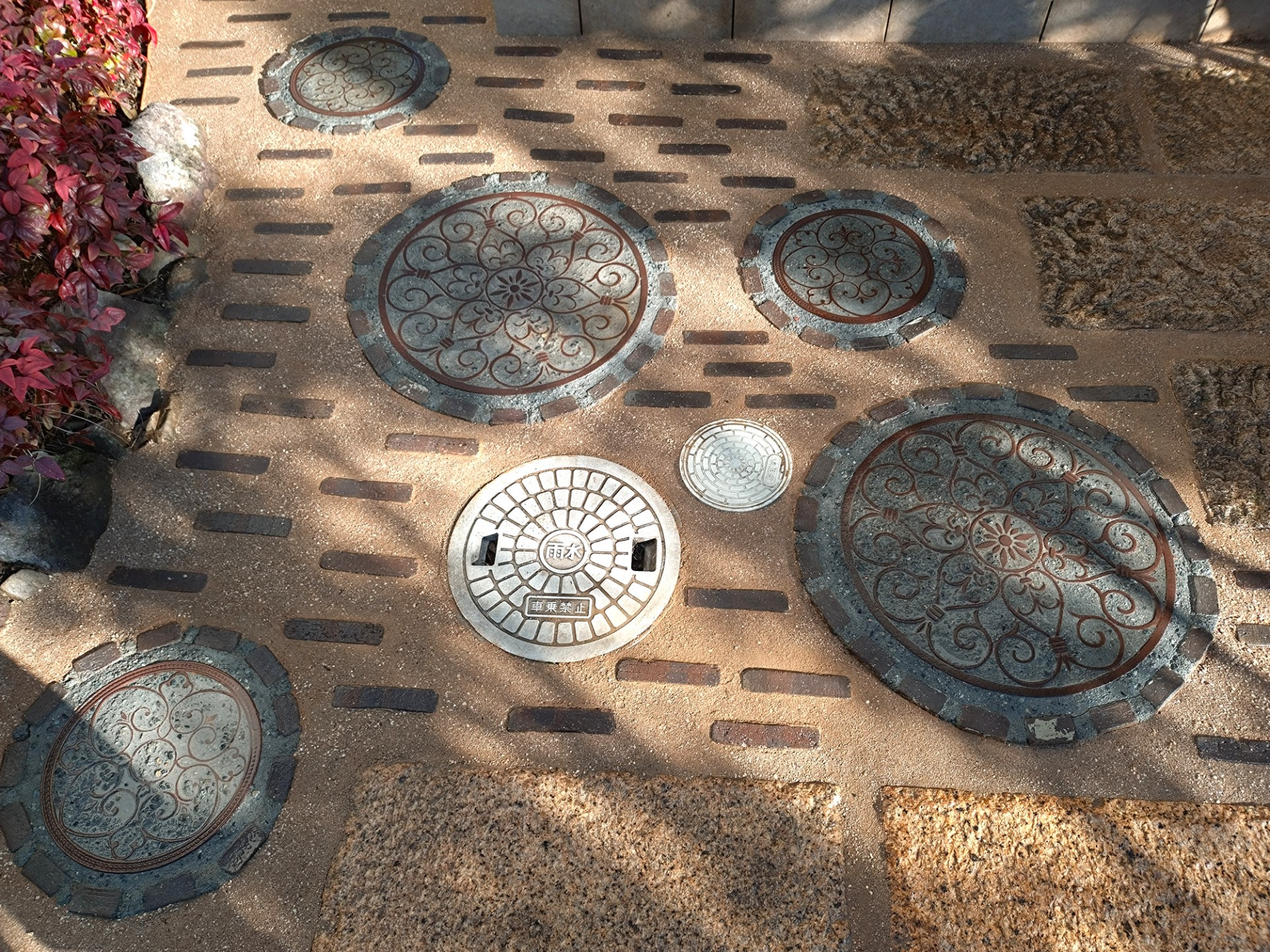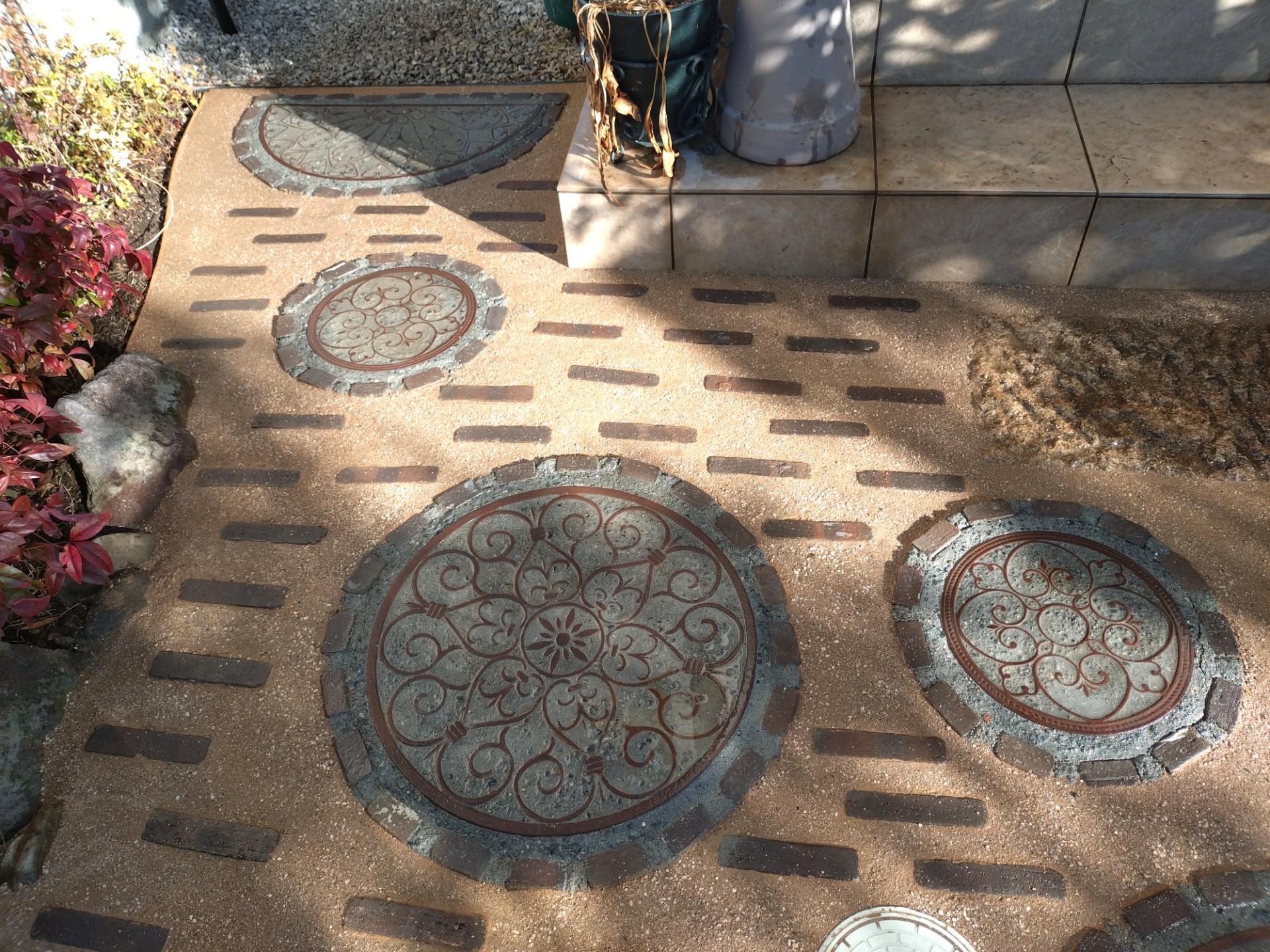 円形の飛び石は施工個所にあった雨水枡の存在感を薄めるうえでも有効に働くと思いました。