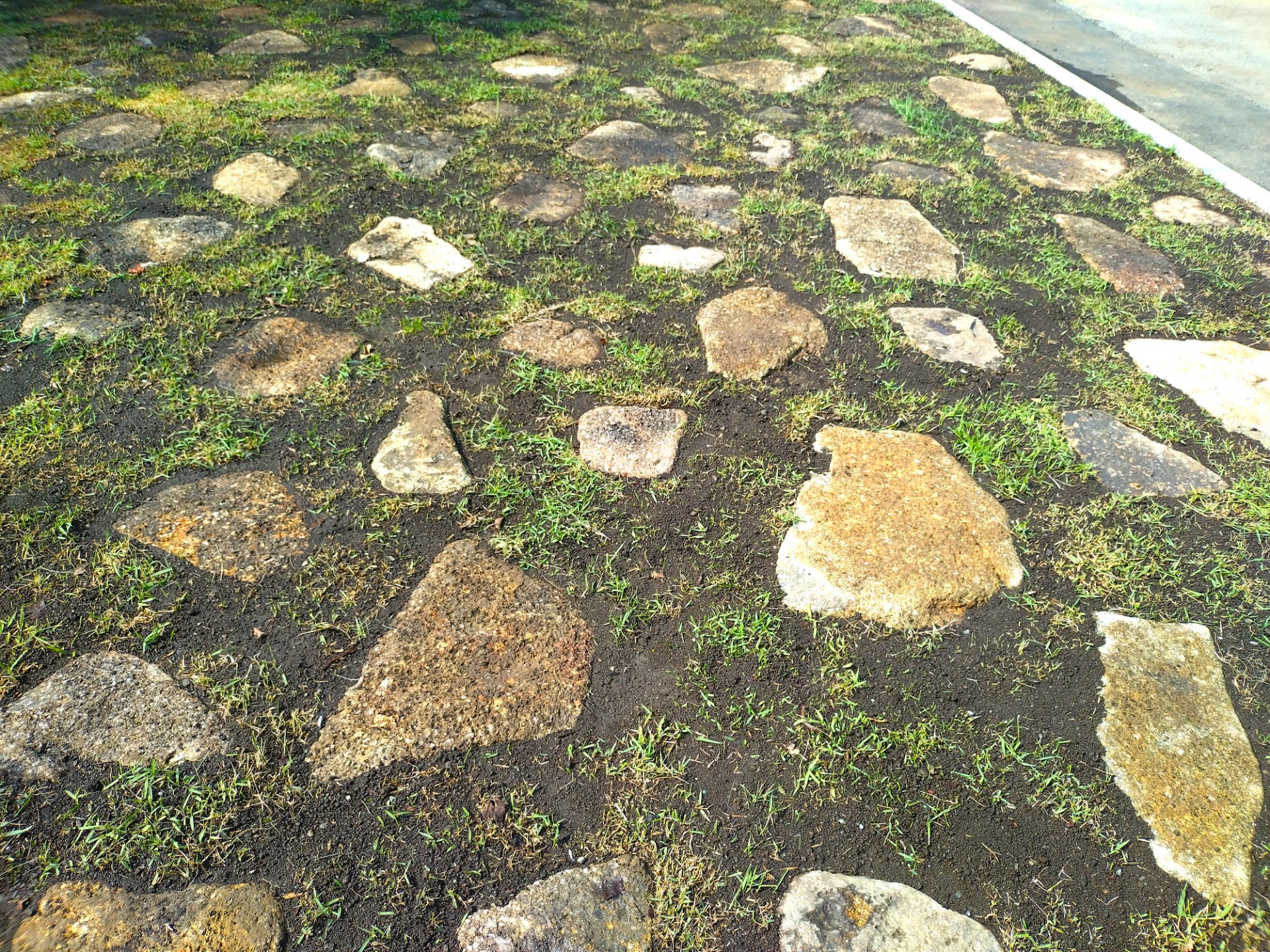 芝生と敷石の駐車場