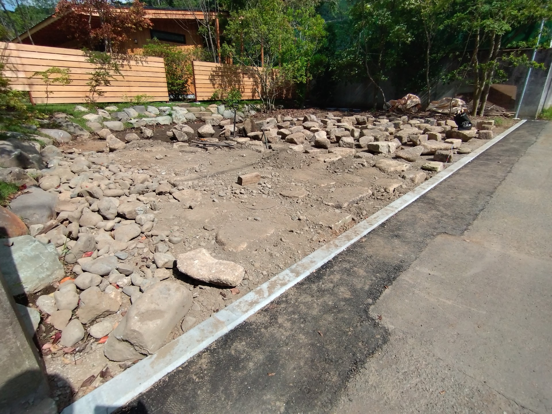 ドッグラン付きの貸別荘の駐車場の施工依頼を承り、芝と自然石を用いるというお施主様の発案に基づき、厚みのある石選びからスタートしました。