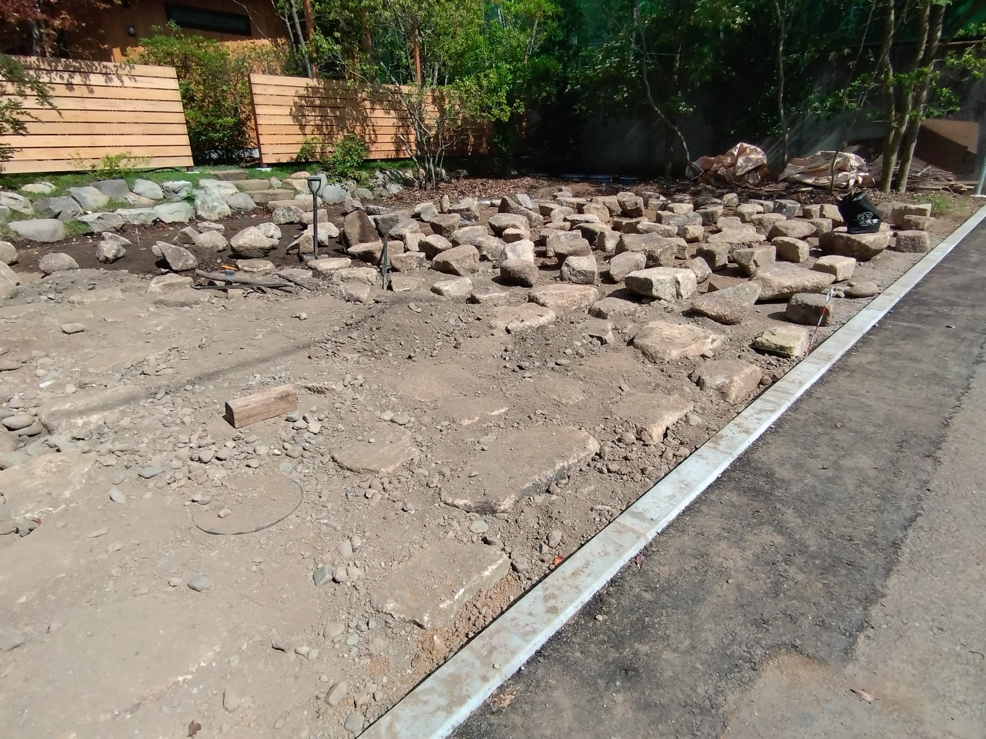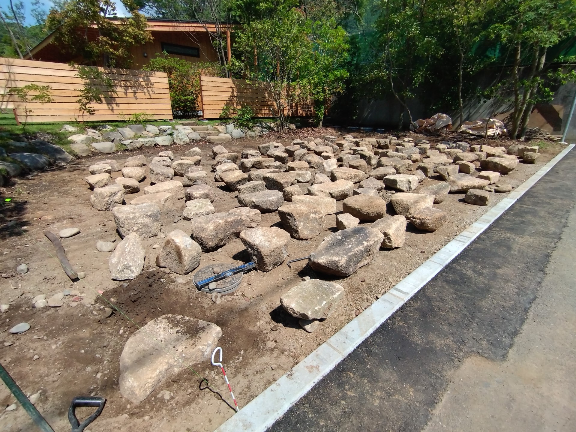 木曾石は平らな面が多く頑丈な石でして、石材屋さんに積まれた山の中から選りすぐりのものを現地に運んだら、バランスを見ながら仮置きです。
